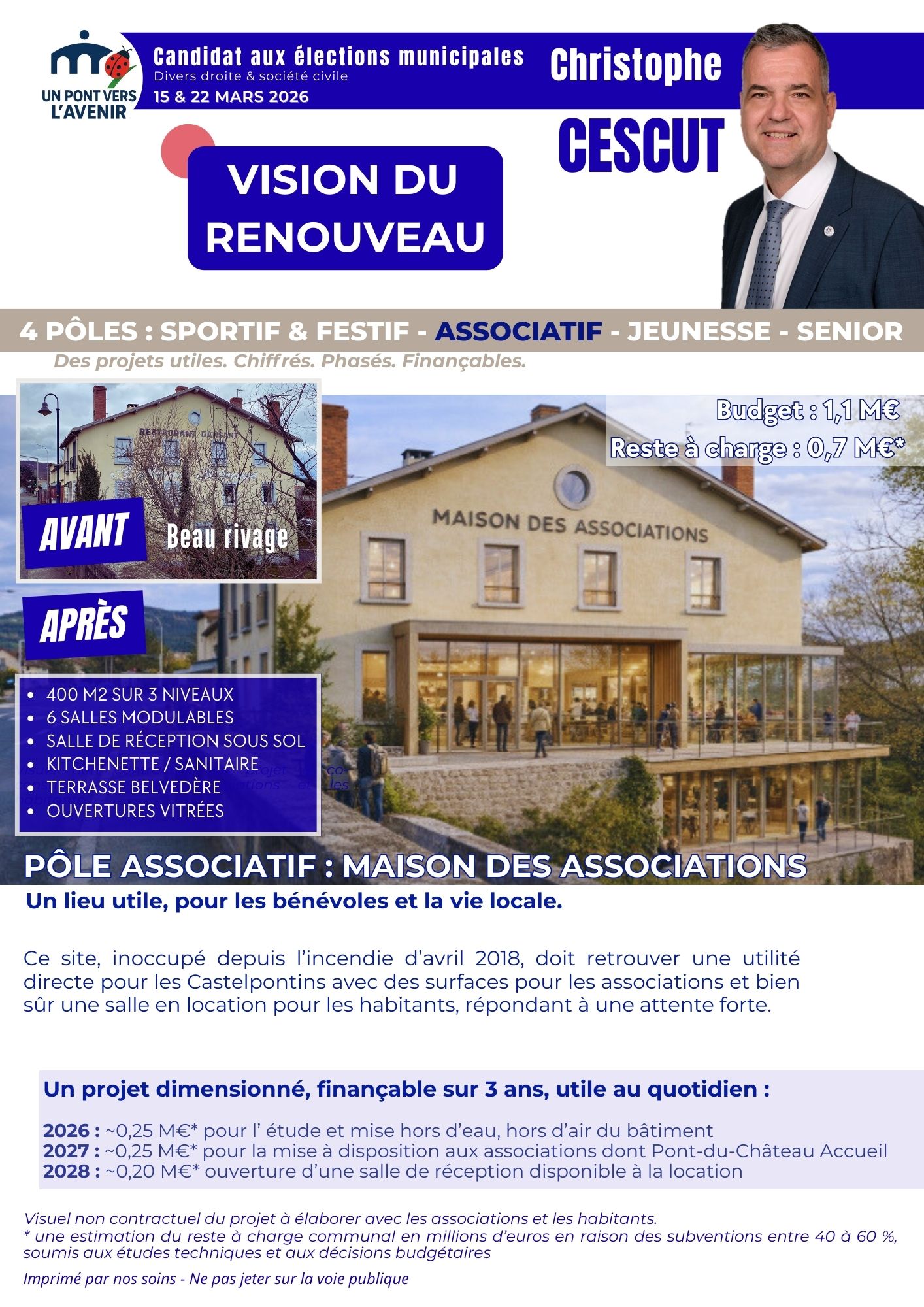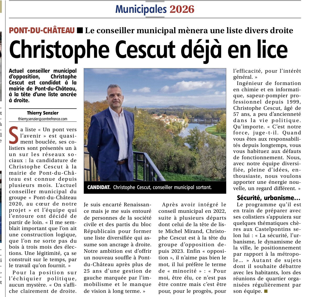Notre groupe, Pont du Château 2020, au coeur de notre projet, avec M. Jérémy Montagné sommes à votre écoute. Pour cela, nous avons des permanences le premier samedi du mois, de 10h à 12h, salle Mathieu Goutain ou par mail à cescut-christophe@orange.fr.